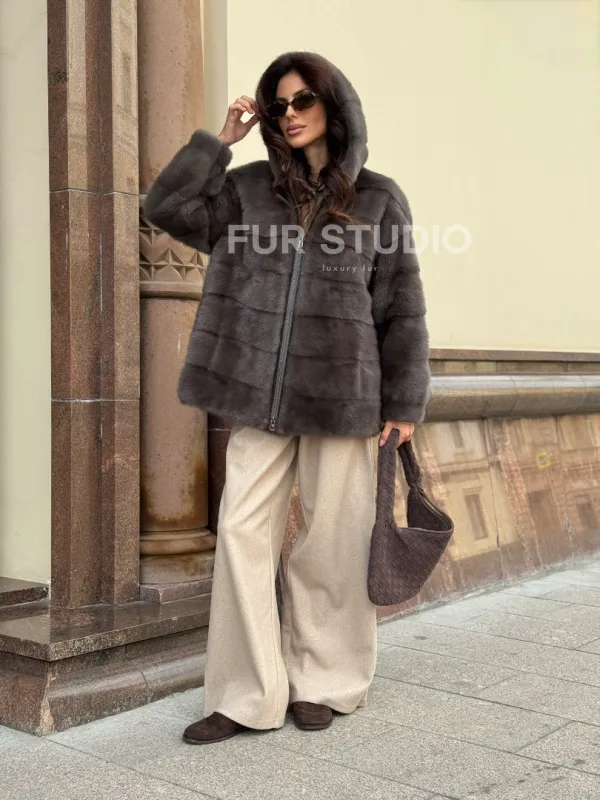 Материал выбранной модели — аукционная норка, доступна в цвете серый. Куртка предлагается в разнообразии размеров, от S до XL, а ее длина составляет 65-70 см, что выигрышно подчеркивает вашу фигуру. Этот вариант идеально подходит для тех, кто ценит роскошь и утонченность натуральных материалов.