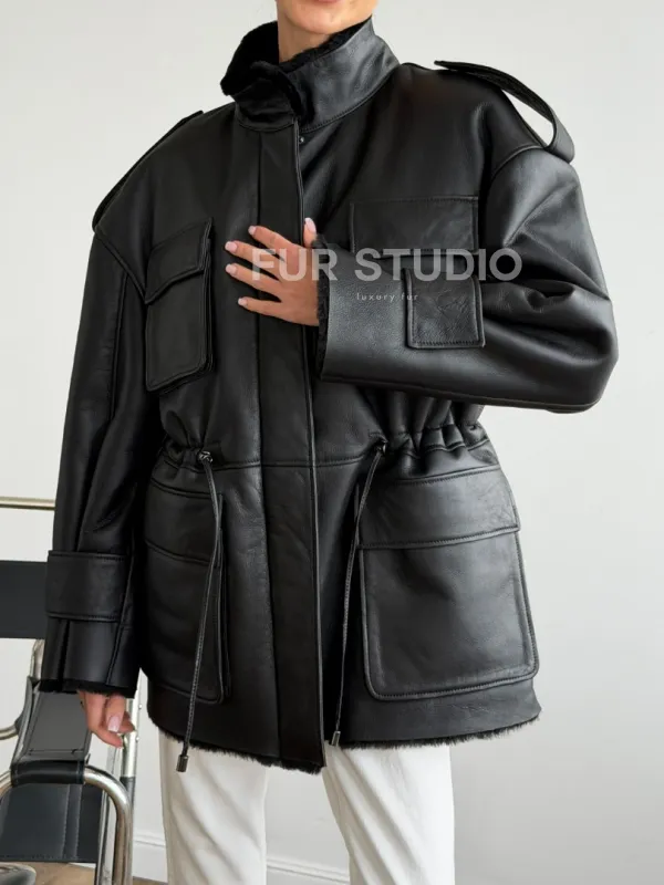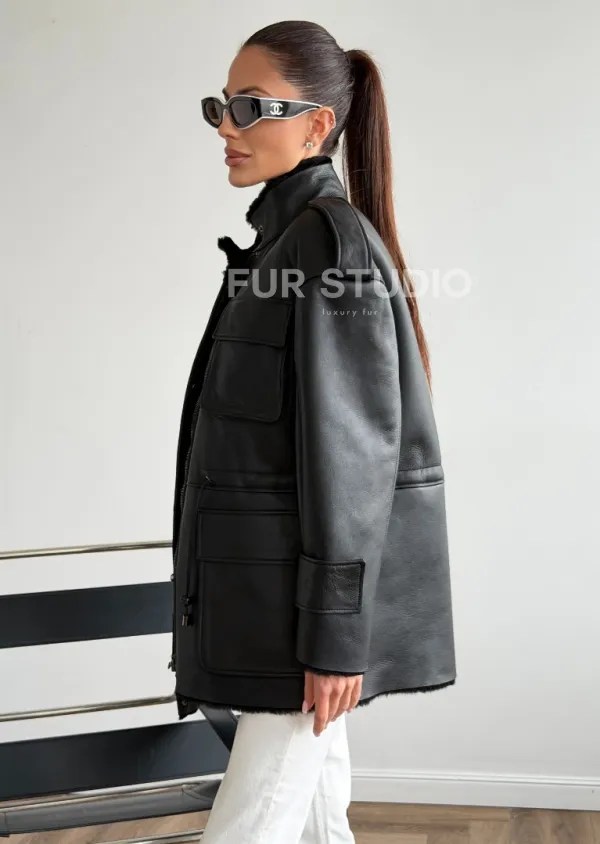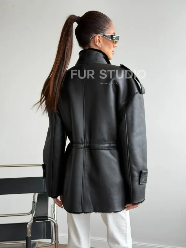 Черная куртка - дубленка из испанского мериноса. Модель предлагается в размерах от 42 до 50. Оптимальная длина моделей 70-75 см подчеркивает линии вашей фигуры. Эта дубленка станет неотъемлемой частью гардероба для тех, кто предпочитает роскошь и утонченность натуральной кожи.