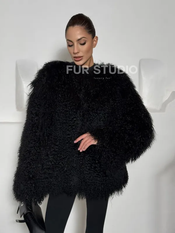 Черная шуба из меха ламы воротник шанель 101496