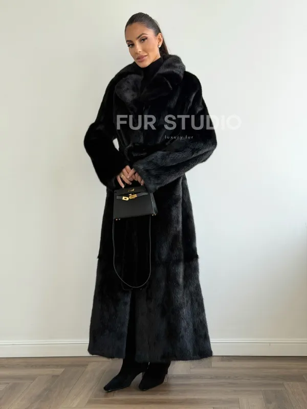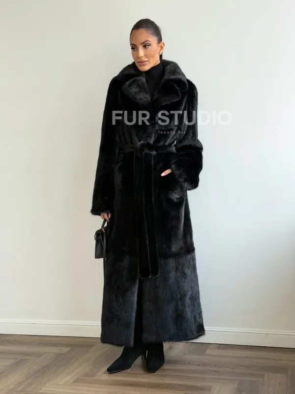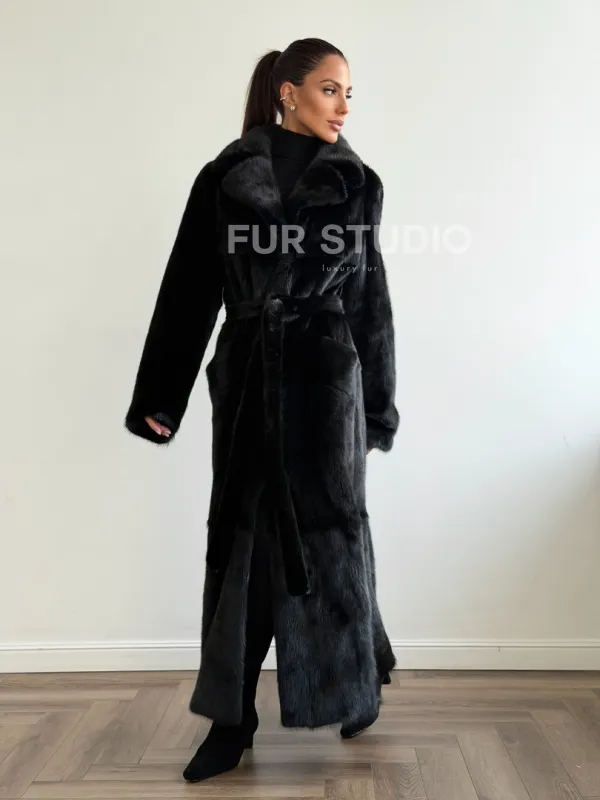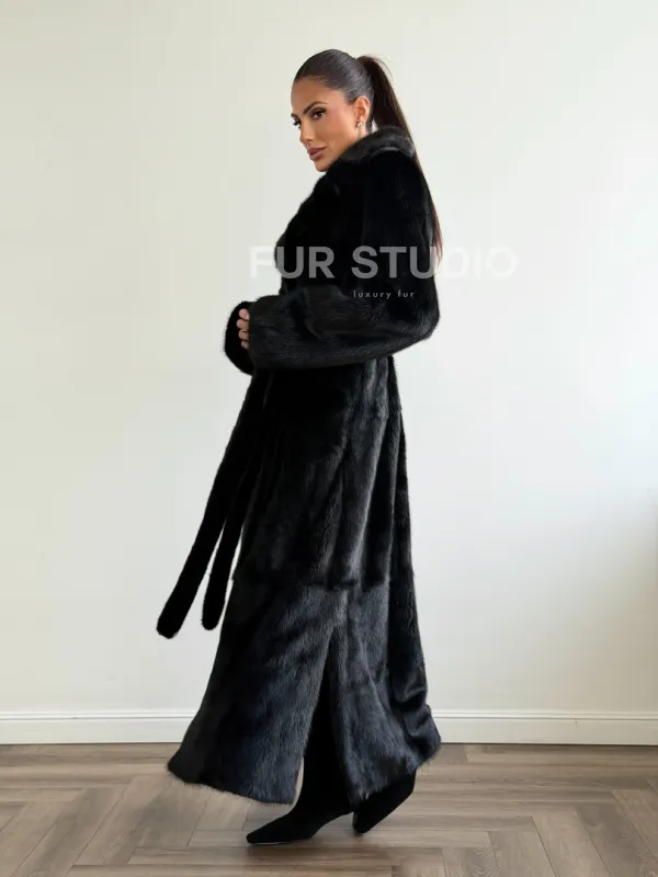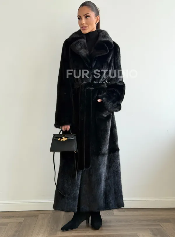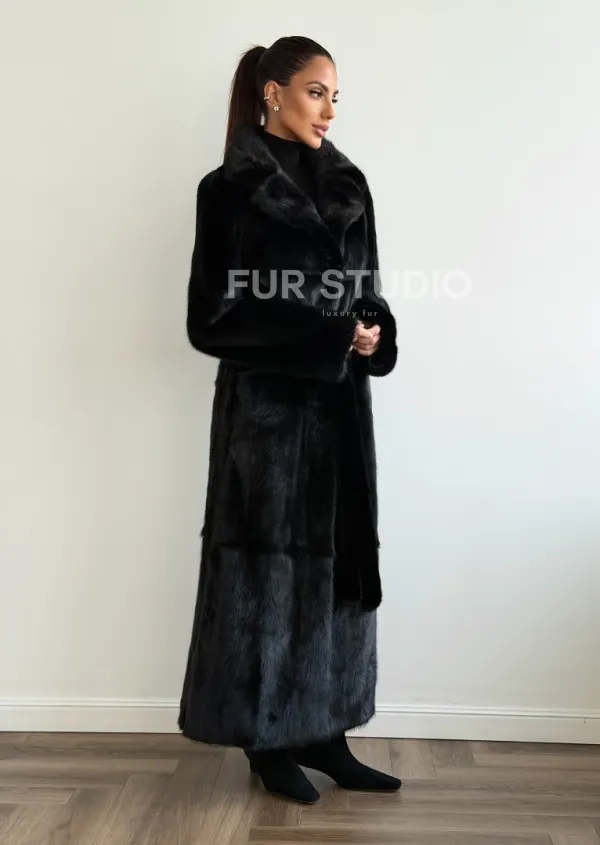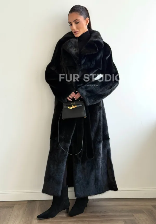 Мех данной шубы аукционная норка , цвет черный. Предлагается в размерах от 42 до 48. Длина модели 125-130 см, что выгодно подчеркивает фигуру девушек. Эта модель идеально подойдет для девушек и женщин, предпочитающих роскошные натуральные меха.