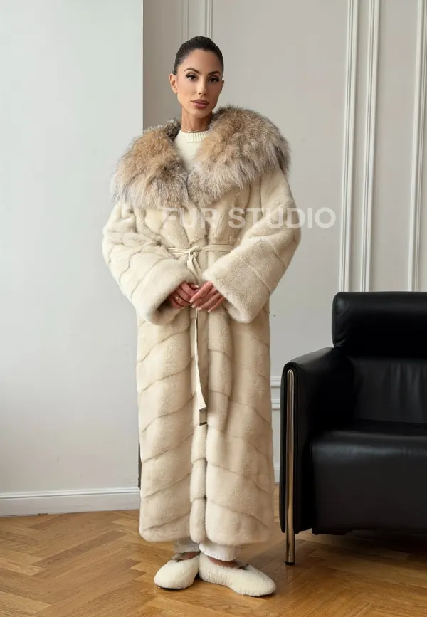 Мех данной шубы аукционная норка, цвет бежевый. Предлагается в размерах от 42 до 52. Длина модели 125-130 см, что выгодно подчеркивает фигуру девушек. Эта модель идеально подойдет для девушек и женщин, предпочитающих роскошные натуральные меха.