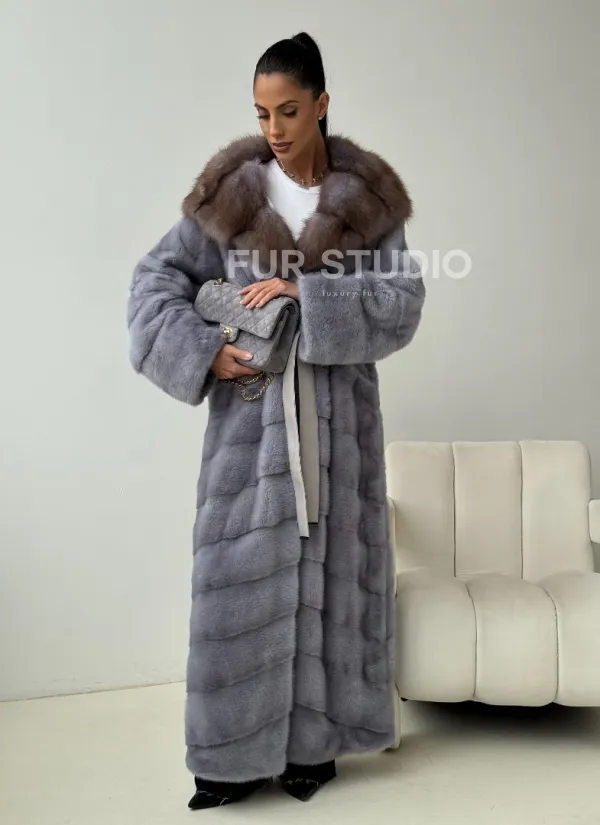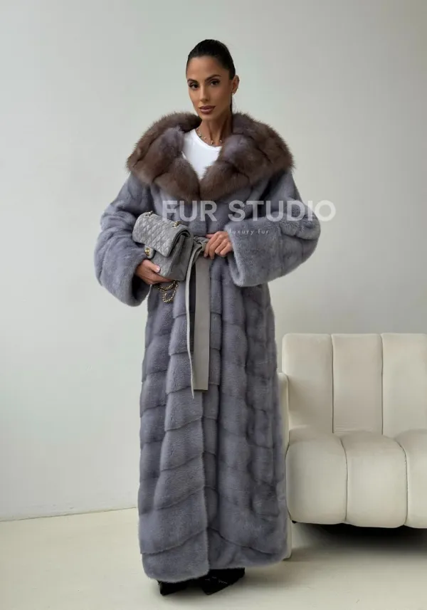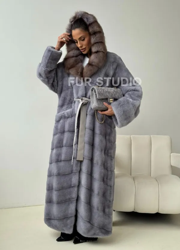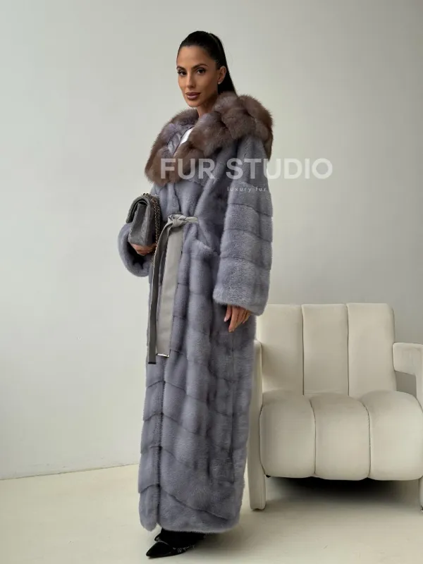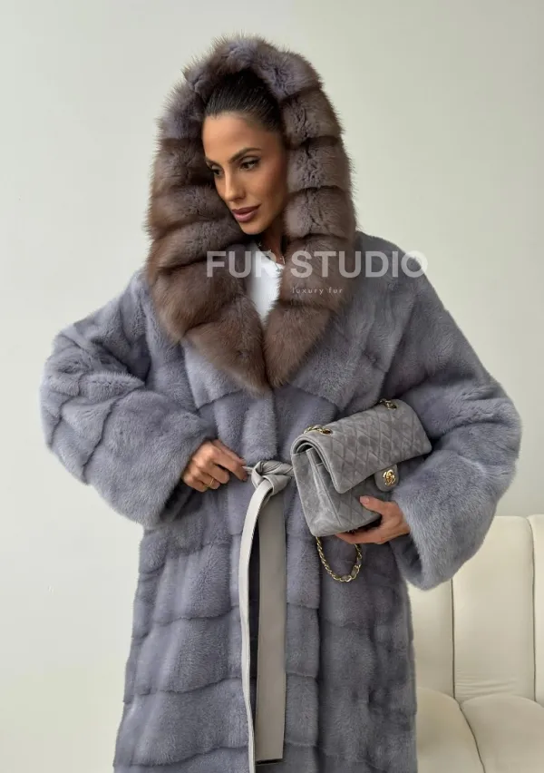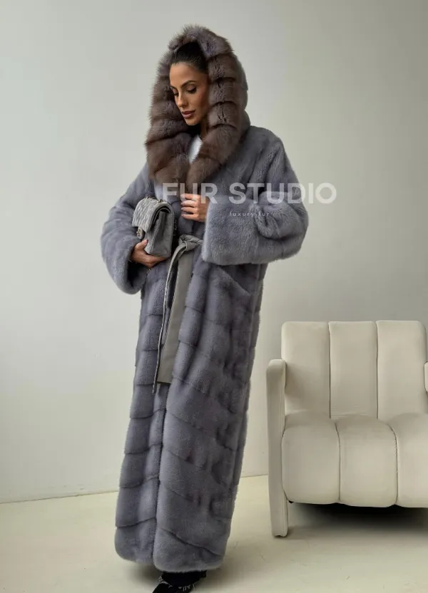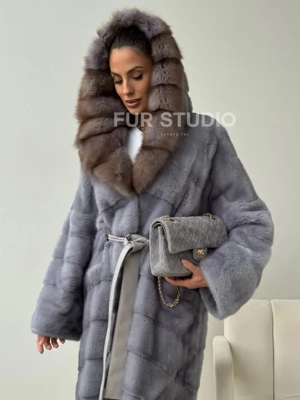 Голубая норковая шуба с капюшоном куницы 102439