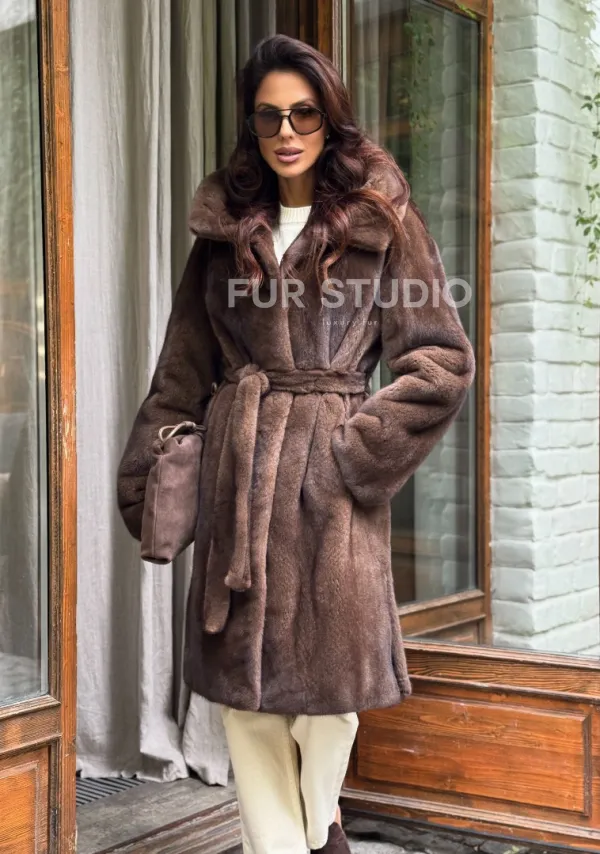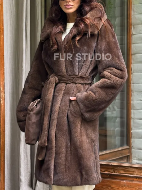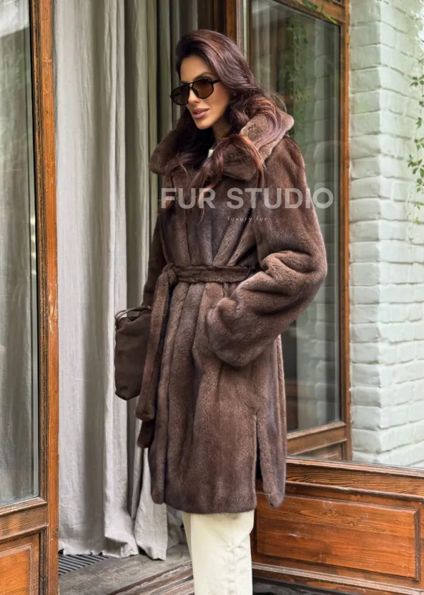 Норковая шуба с капюшоном - цвет орех 102240