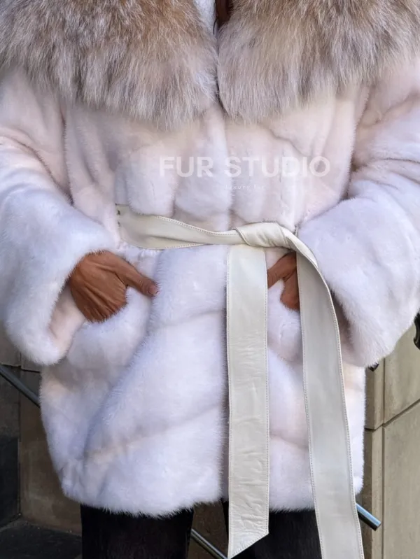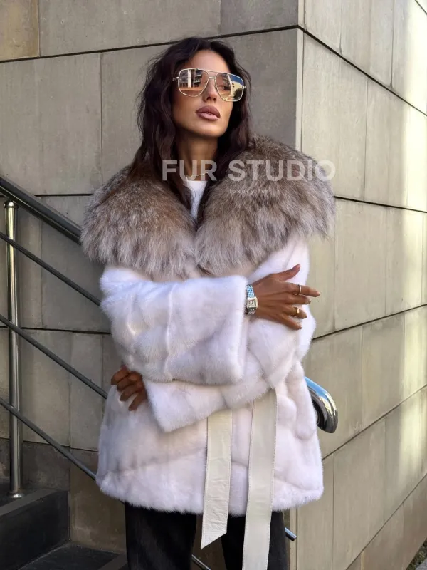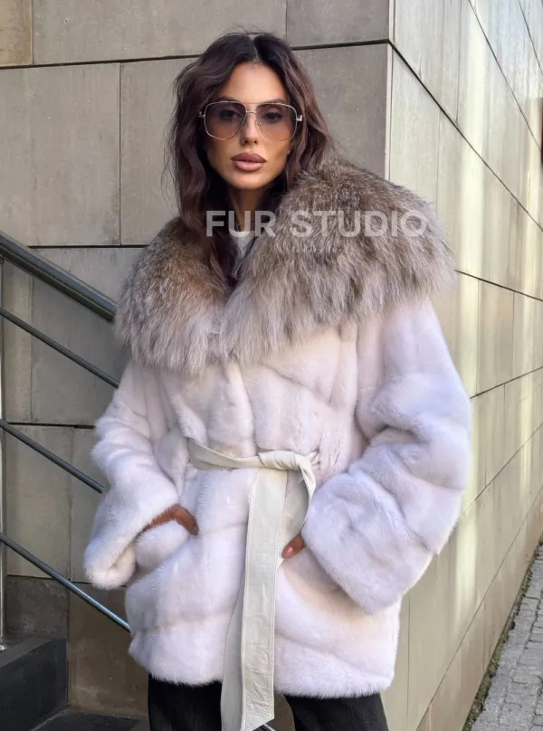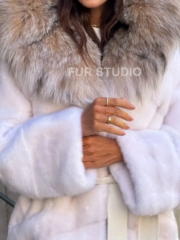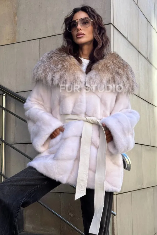 Шуба-пончо из меха норки с капюшоном из рыси – выбор утонченных дам с изысканным стилем. В модели вы будете выглядеть роскошно и женственно. Необычный крой подчеркивает достоинства фигуры. Оригинальный пояс очертит талию и визуально создает фигуру типа «песочные часы». Оптимальная длина удобна в носке и не сковывает движения.