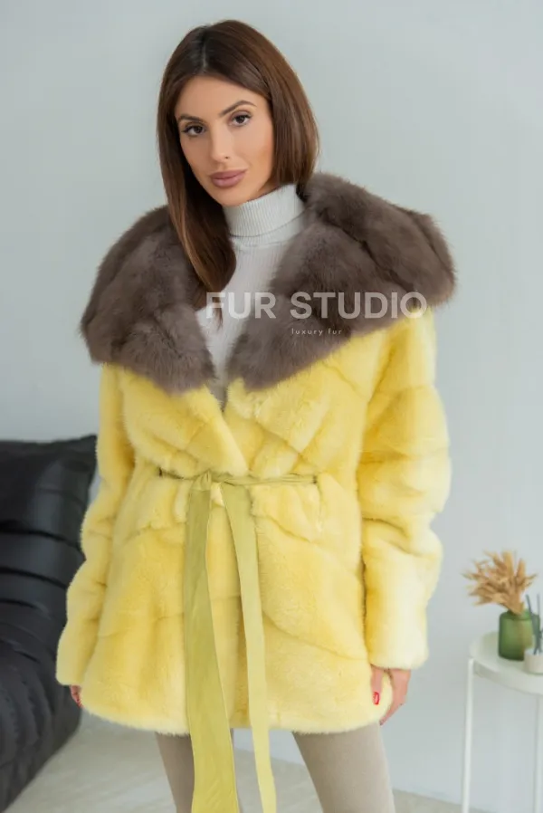 Мех данной шубы аукционная норка , цвет желтый. Предлагается в размерах от 42 до 50. Длина модели 65-70 см, что выгодно подчеркивает фигуру девушек. Эта модель идеально подойдет для девушек и женщин, предпочитающих роскошные натуральные меха.