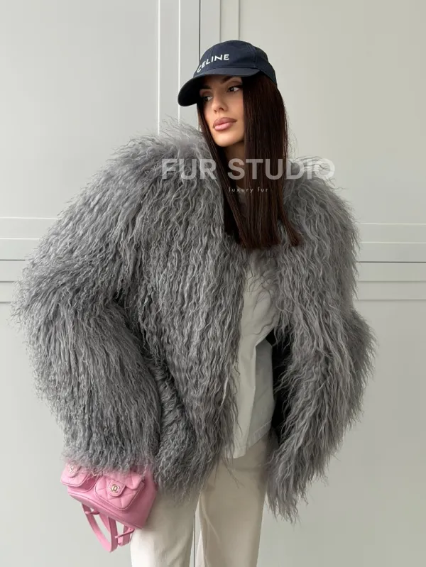 Серая шуба из натурального меха ламы 102811