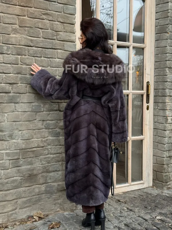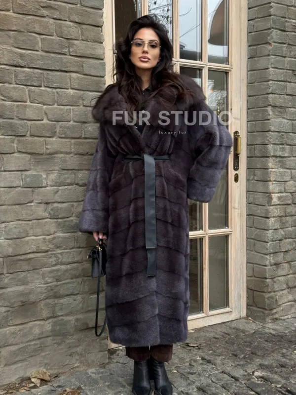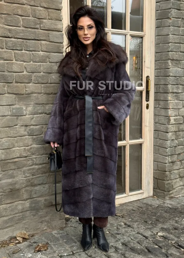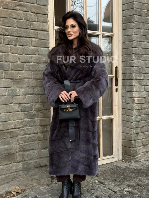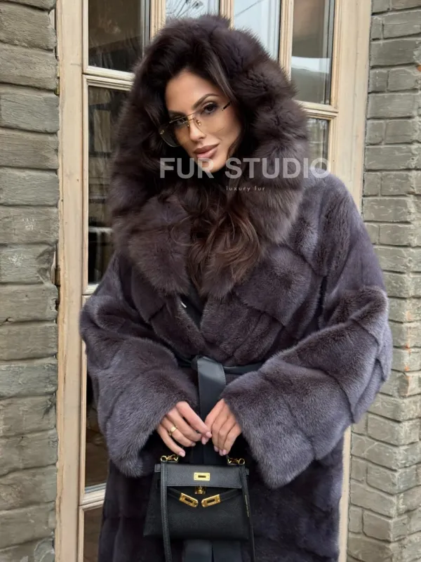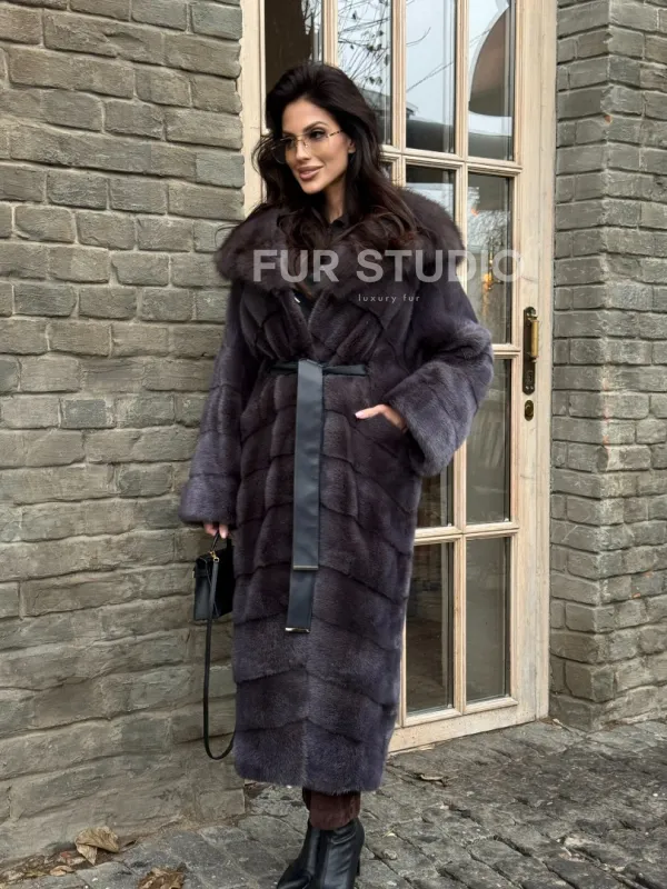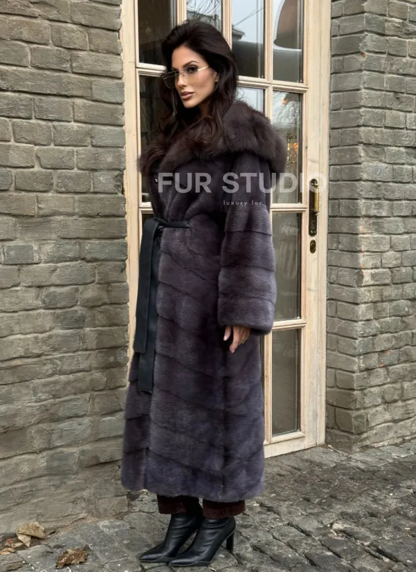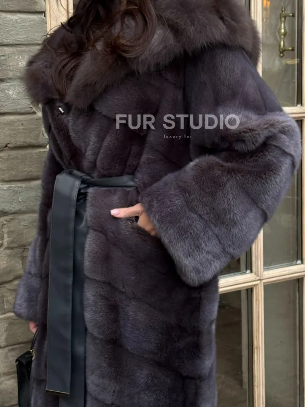 Удлиненная шуба из меха норки с капюшоном куница 101425