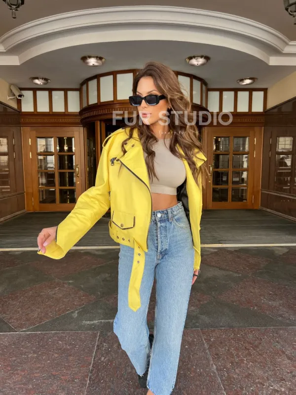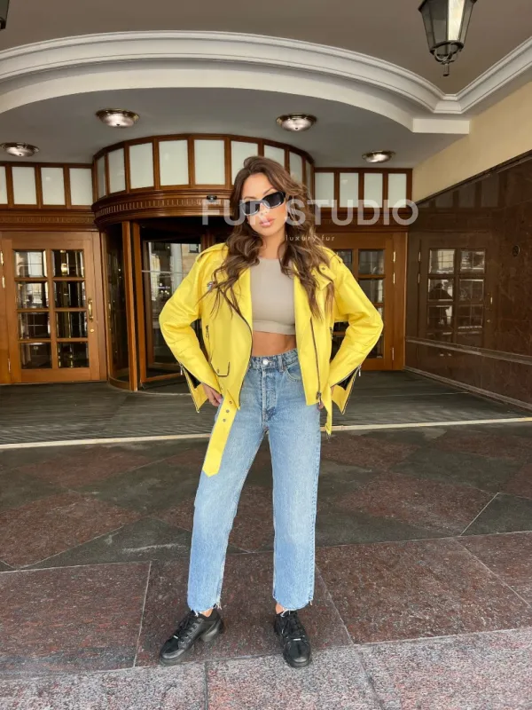 Модель сочетается с базовым гардеробом, подойдет под вечерний look. Добавьте к образу стильную сумочку или рюкзак, и вы будете неотразимы. Широкий пояс, застегивающийся на бедрах, добавит женственности. Купить желтую косуху из натуральной кожи могут женщины, которые не боятся экспериментировать и приковывать внимание к своей персоне.